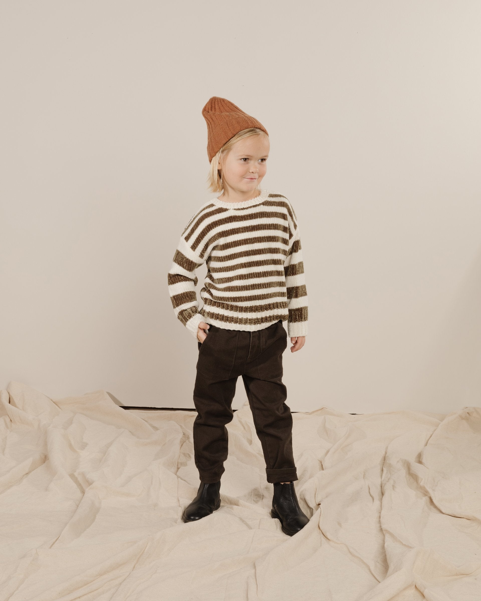 Super comfy chenille pullover sweater. Cozy relaxed fit with ribbing at neckline, sleeve openings and bottom opening. Color: olive + ivory stripe.